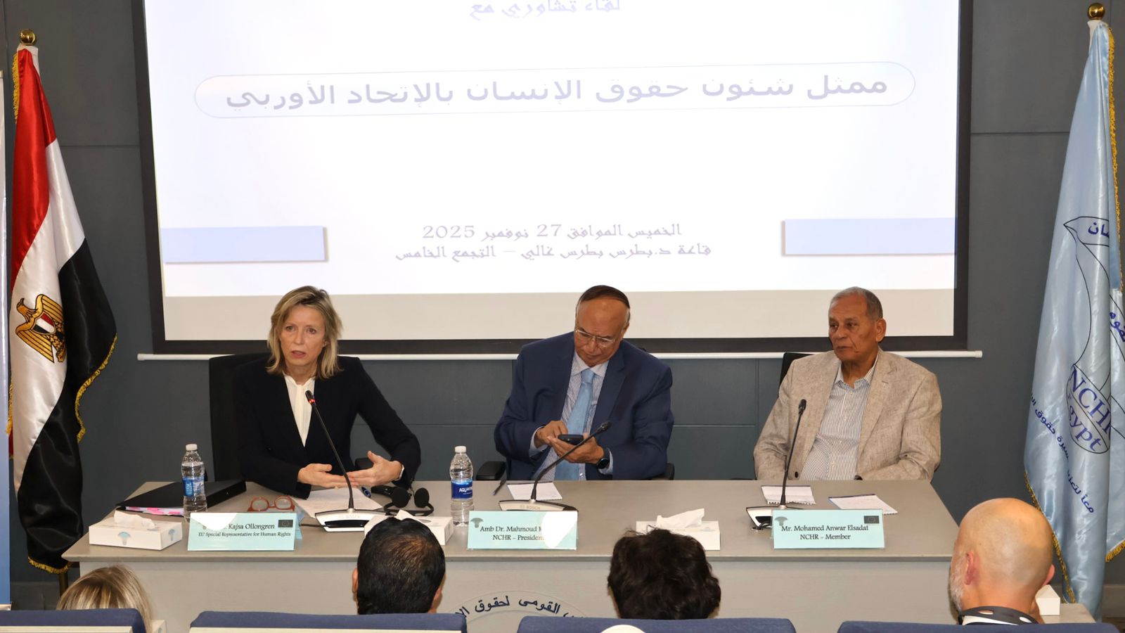 استقبل المجلس القومي لحقوق الإنسان برئاسة السفير محمود كارم،السيدة كايسا أولونجرين الممثلة الخاصة للاتحاد الأوروبي المعنية بحقوق الإنسان والوفد المرافق لها، بحضور الدكتور هاني إبراهيم الأمين العام للمجلس، وعدد من أعضاء المجلس.