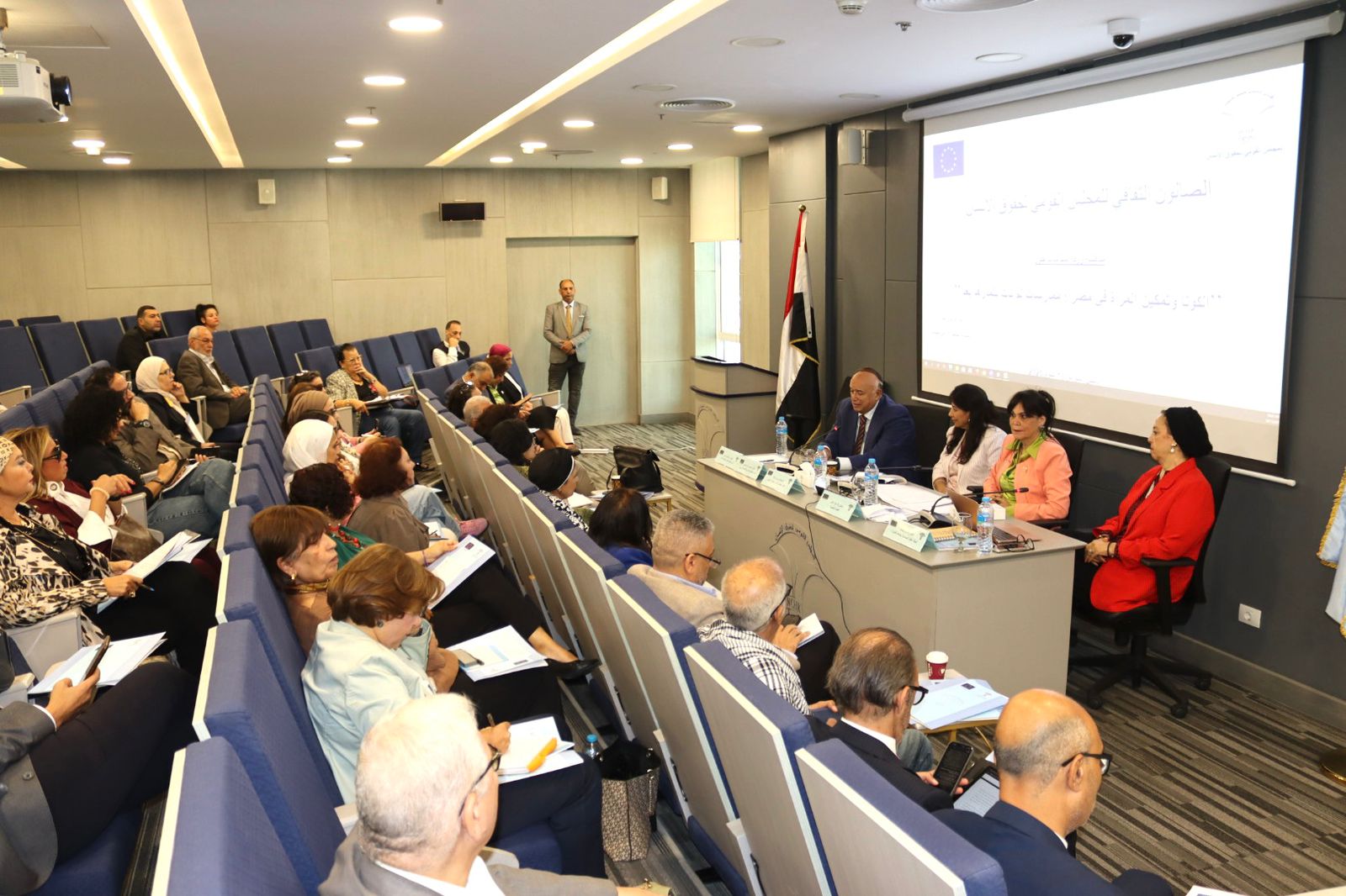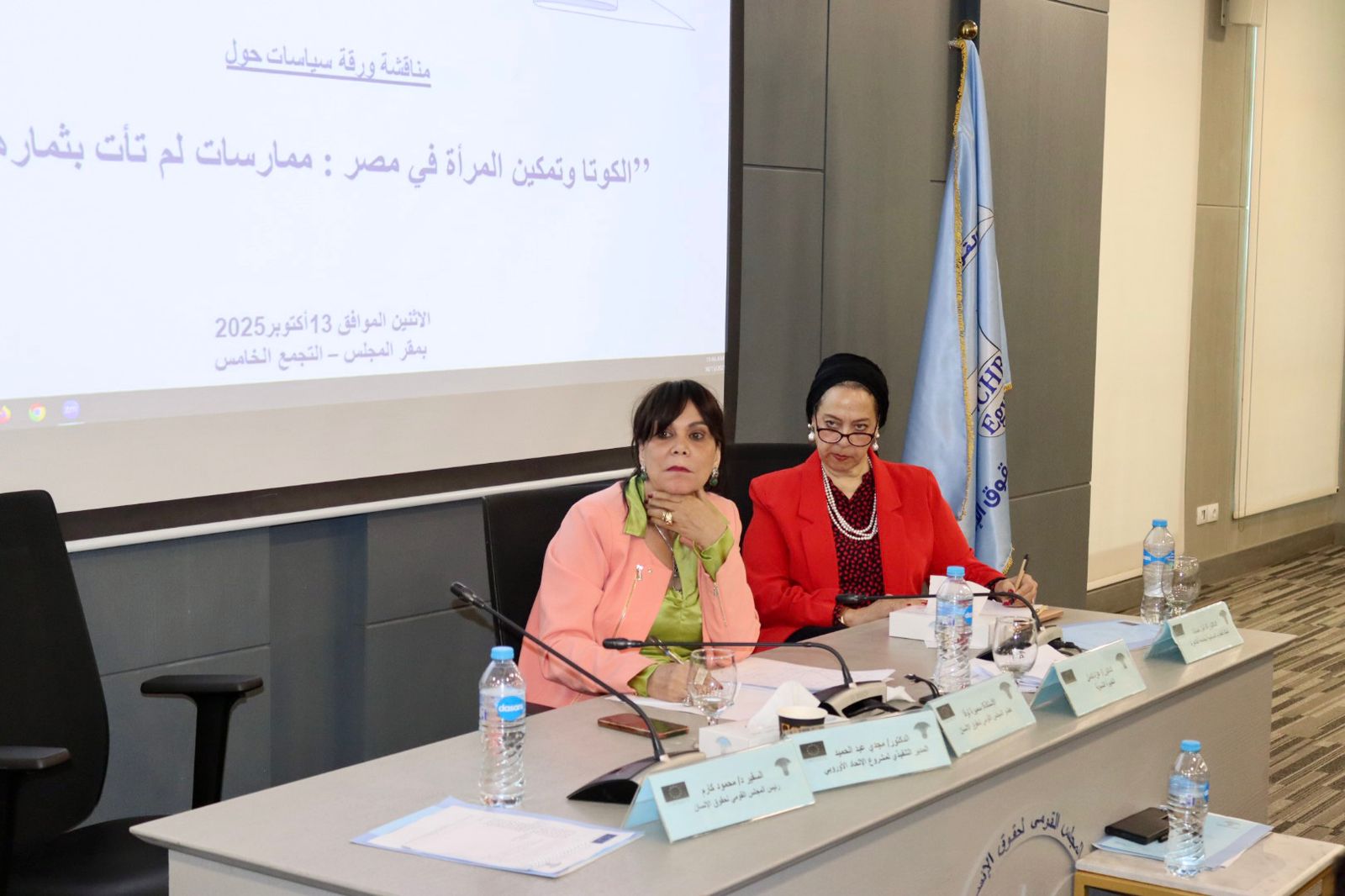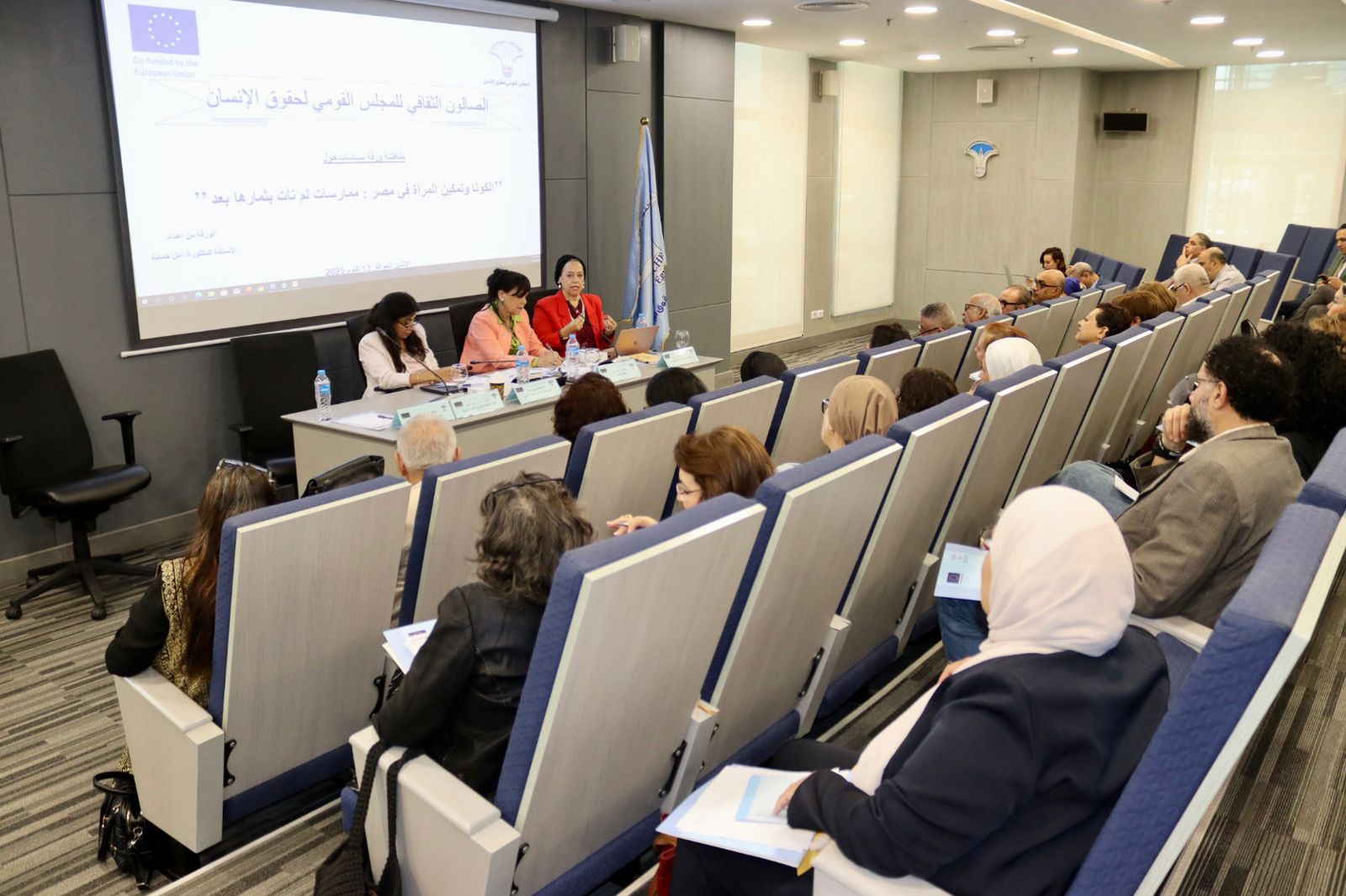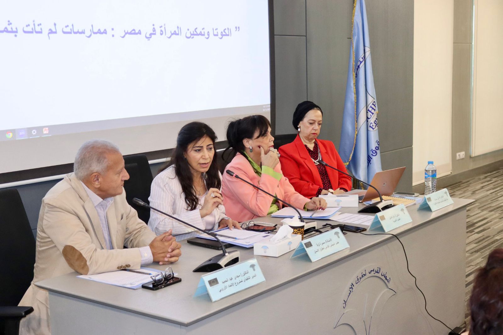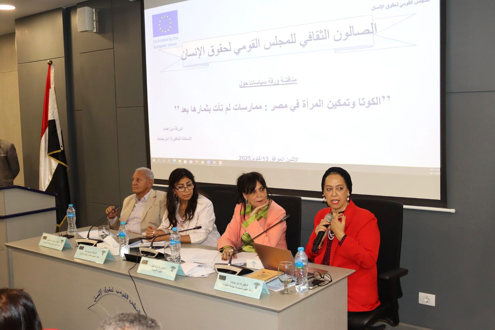 عقد المجلس القومي لحقوق الإنسان بالتعاون مع الاتحاد الأوروبي لقاءً حواريًا لمناقشة ورقة سياسات بعنوان "الكوتا وتمكين المرأة في مصر: ممارسات لم تأت بثمارها بعد"، والتي قدمتها الدكتوره أمل حماده أستاذ العلوم السياسية ، بمشاركة السفير محمود كارم رئيس المجلس، والدكتور مجدي عبد الحميد المدير التنفيذي للمشروع الأوروبي، والدكتورة سميرة لوقا عضو المجلس ،وبحضور الدكتورة عزة كامل الخبيرة النسوية ونخبة من الشخصيات العامة والمجتمع المدني.